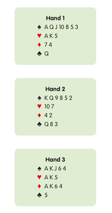 With Hand 1, you open 2♣ intending to rebid 2♠ to show the same as an Acol two in spades. With Hand 2, you open 2♠, weak. With Hand 3, where you would have opened an Acol 2♣, you open 2, the big bid in Benjamin.