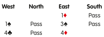 After East’s 3♠ raise sets spades as trumps, West’s 4♣ and East’s 4♦ are both (control-showing) cue bids. 4♣ must show interest in a slam because, with no such interest, West would simply raise 3♠ to 4♠.