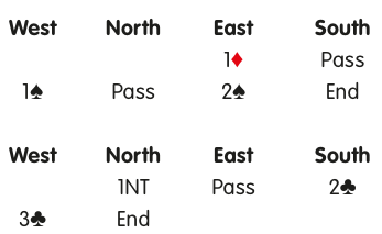 In the second auction, West again becomes declarer. South is an opponent and so his 2♣ bid has no significance in determining the eventual declarer.