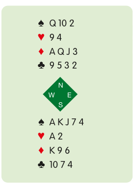 On the layout above, you should draw trumps and run the diamonds. Drawing trumps is essential to stop someone from ruffing one of your diamond winners.