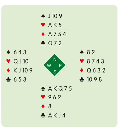 By ruffing dummy’s three losing diamonds with top trumps, you end up with three trump tricks, four club tricks, three tricks from the red suit winners and three tricks by trumping diamonds in hand.
