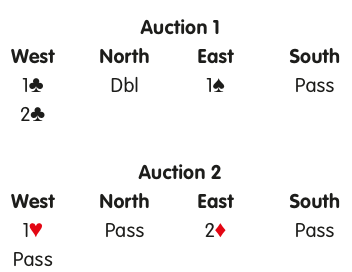 In auction 1, if West has four spades and East does not, West has fielded the psyche by failing to support spades. In auction 2, West’s pass of the forcing response exposes the psyche. East can legally proceed on the assumption that West has psyched.