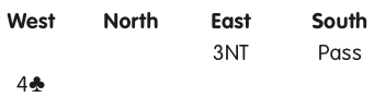 Facing the Gambling 3NT opening, which usually shows a solid minor and little outside, West decides he has too few stoppers to pass 3NT. He bids 4♣ expecting East to pass with a long suit of clubs and otherwise to correct to 4.