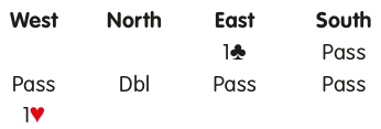 West’s rescue into 1♥ suggests long hearts and short clubs, clearly in a hand too weak to bid the first time. West might hold: