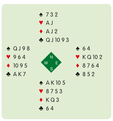 South plays in 3NT without having bid any suits. When West leads the ♠Q, you, East, follow with the ♠4, your lowest card in the suit, as an attitude signal to say that you do not like spades.