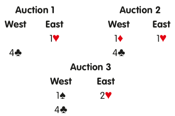 In these auctions, West’s 4♣ is a splinter, showing the support and values to raise to 4♥ with a shortage in clubs.