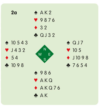As South, you play in 7NT. West leads the ♣10. You have twelve top tricks and if either red suit breaks 3-3 then there will be no problem. You start by cashing two clubs and three top hearts. The heart suit fails to break kindly but you give yourself an extra chance by arriving in position 2b) where East has already discarded a club on a heart.