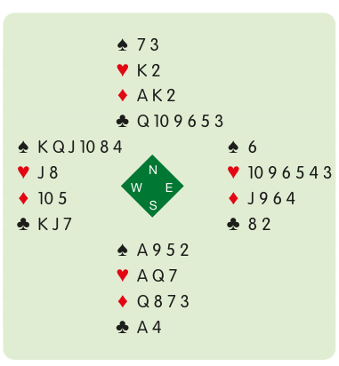 You know from the bidding that West holds the ♣K but there is no point playing on clubs as West has plenty of spade winners to cash. Instead, you try three rounds of diamonds and West discards a club on the third round. You continue with three rounds of hearts.