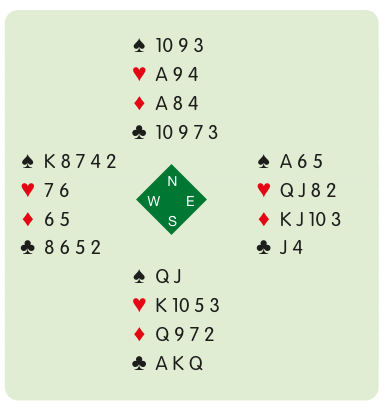 South plays in 3NT after East opened the bidding. West leads the ♠4 to the ♠A and ducks the spade return. Even after the ♣J falls, declarer can see only eight tricks, so he cashes a third club, crosses to the A, cashes the ♣10 and leads a spade. West can do no better than run the spades, the last one of which ‘suicidally’ squeezes East.