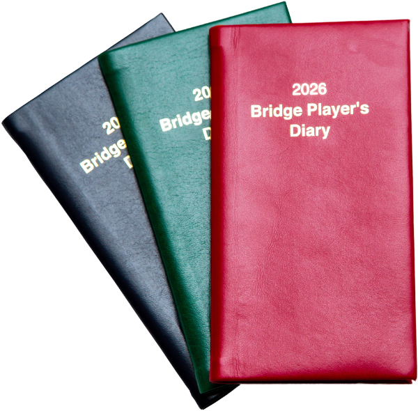 This luxury Bridge Player’s Diary has a soft leather-like cover and is available in ruby red, navy blue or bottle green, with a ball-point pen in the spine.